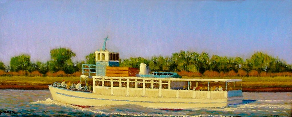 Una de las canoas frente a Punta Umbría yendo hacia Huelva en una tarde cualquiera del verano. El nombre de la canoa no sabría decirlo. Está pintada de memoria con toda la exactitud de quien las ve multitud de veces y se siente atraído por algo tan entrañablemente nuestro. Es un óleo sobre tabla en un tamaño 4M.